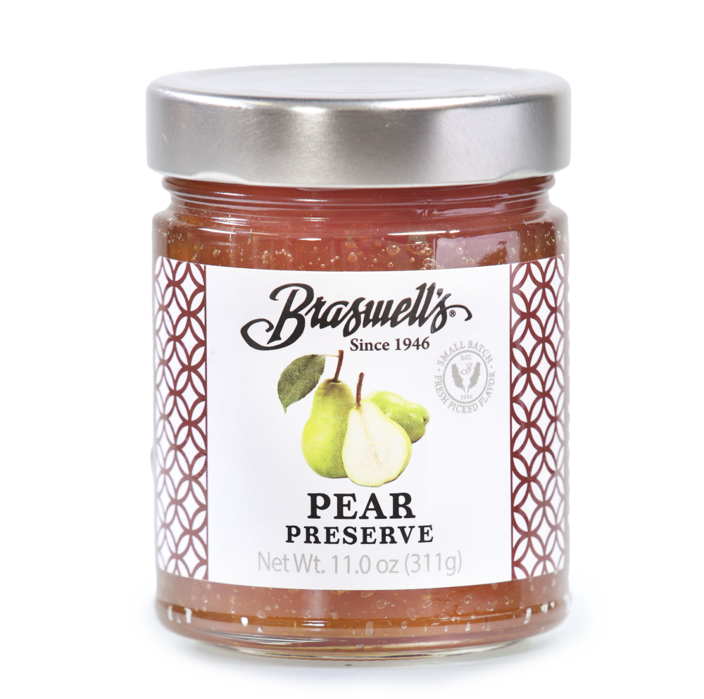 We use locally harvested Kiefer and Orient pears. Crisp, sparkling pears and pure cane sugar are slowly cooked until a rich, amber hue is required. It's a classic homemade taste that you will be proud to have on your table. Use Braswell's Pure Pear Preserves as a spread on buttered biscuits, on cheese trays, or a glaze for pork and poultry.